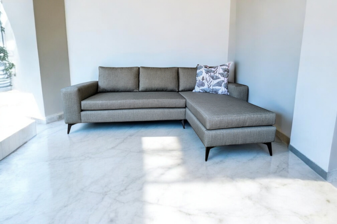 Elevate your living space with our brand new versatile 2-seater sofa featuring a convenient daybed, upholstered in a chic light oatmeal-colored designer fabric. This modern piece measures 2.5M x 1.6M, providing ample seating and lounging space without overwhelming your room.